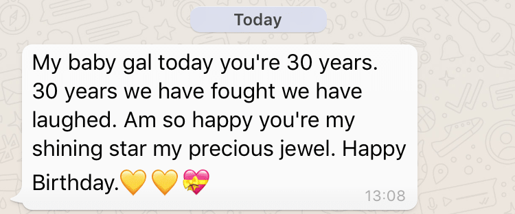 I learnt to love my birthday from my mother so my first birthday without my mum was extremely difficult, but also very encouraging as my family and friends were there for me. They knew how difficult it would be for me to celebrate my first birthday without mum so they formed a group chat and did all they could to make sure I did not get swallowed whole by the loss and despair. My birthday has become easier to bear with time, but it always breaks my heart to know these are the last birthday messages I will ever receive from my mum: