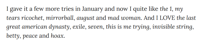 I like to save special things for special occasions so I have been saving reading the magazine for the right time. When I started thinking about what I can do to make Mother’s Day more bearable for me, I realised that this month, more so this week, is the perfect time to break it out. I have also been listening to folklore A LOT, like every two days, and all the folklore songs I previously said I like in my evermore post I now LOVE!!!