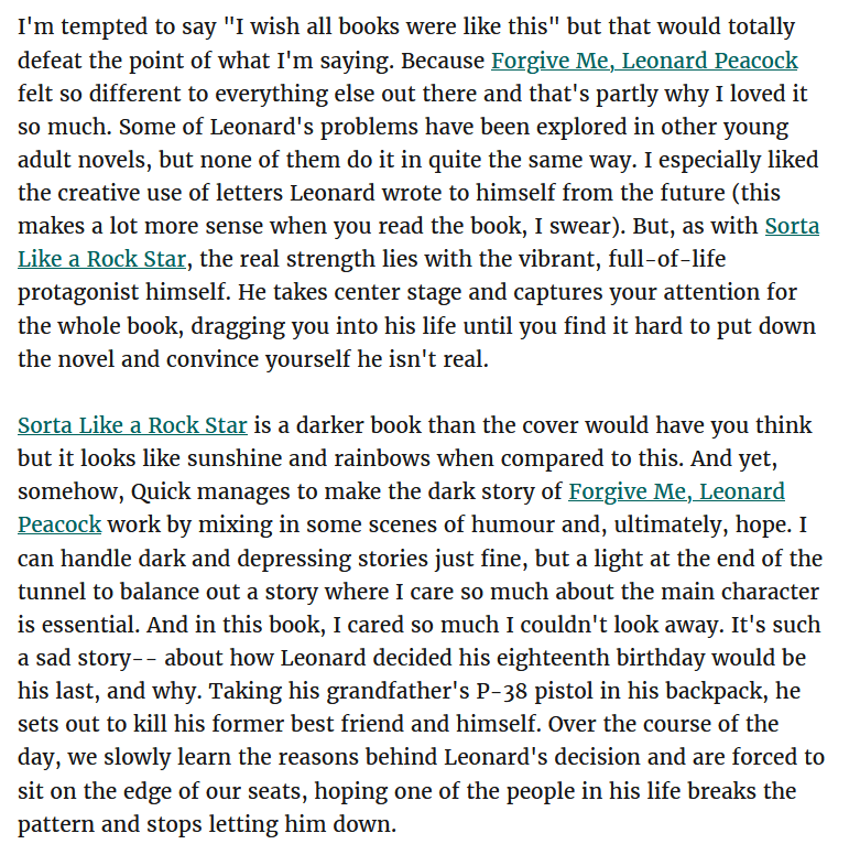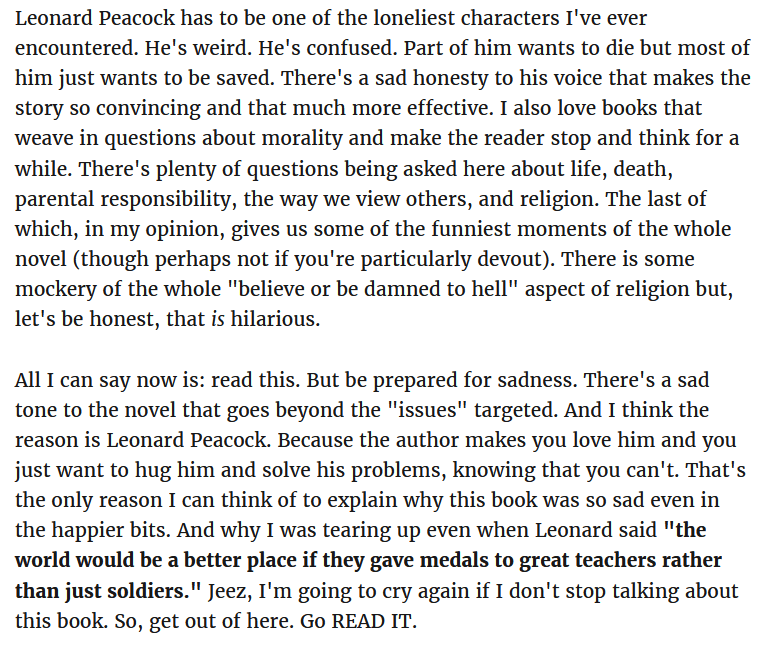 Her beautiful, moving review ultimately coloured my expectations because when I was reading I kept waiting to feel the sadness she felt while reading this book, but it never came. It’s not that Leonard’s story was not a sad one. His parents were only parents to him by virtue of the fact that they gave birth to him. And as a preteen he went through a deeply traumatic experience that no one should ever have to go through. That said, trauma should explain our behaviour, not excuse it. And I just couldn’t connect with Leonard’s pain because I felt like he was using his trauma as an excuse to be an asshole. Though perhaps it’s also not fair to blame him because his parents, the people who should have been there for him, abandoned him when he needed them most and so he probably did the best he could with what he had.