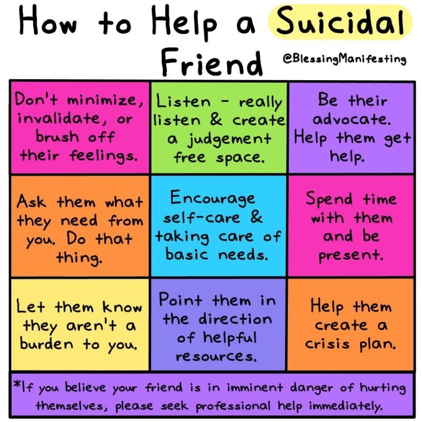 If you have a friend who struggles with suicide ideation, show up for them while still caring for yourself. Don’t pour from an empty vessel. Educate yourself.