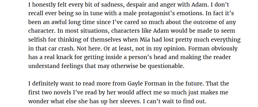 I read If I Stay last year and I liked it so much that I read it in 24 hours. Going in I had no idea there was a sequel until I finished the book and came across this riveting review from Emily May.